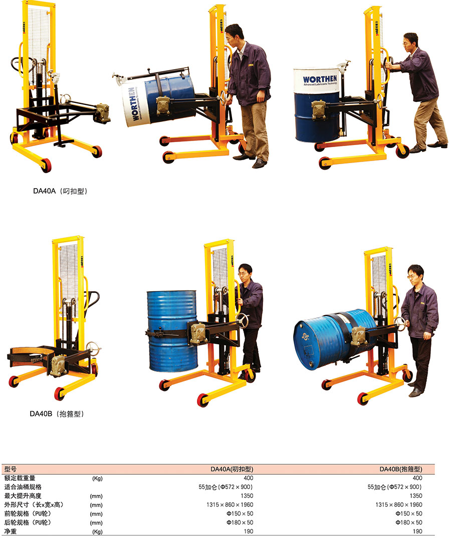 ● DA40A適用于鋼制油桶的搬運(yùn),DA40B適用于鋼制油桶或塑料油桶的搬運(yùn)。